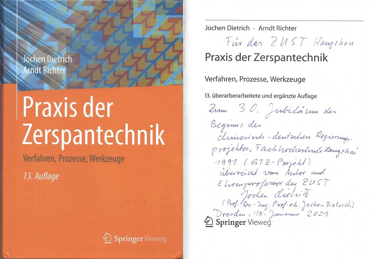 新学期伊始,申搏名誉教授、德国德累斯顿技术经济大学教授约亨·迪特里希(Prof.Dr.-Ing. Jochen Dietrich)向申搏邮寄捐赠其新出版的学术专著《切削加工技术实践(第13版)》,校长赵东福代表学校给迪特里希教授和德累斯顿技术经济大学回信。