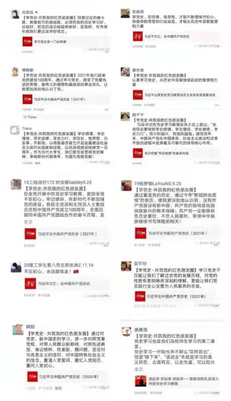 “我每天都能在朋友圈看到学院老师和同学分享的相关内容,还发动身边同学一同参加,互相学习党史。”土木工程(中法班)182黄小妮说,通过师生的日常分享,她重温了中国共产党百年光辉奋斗历程,加深了对党章党史、党规党纪的理解和认识,感悟到马克思主义的真理力量和实践力量。