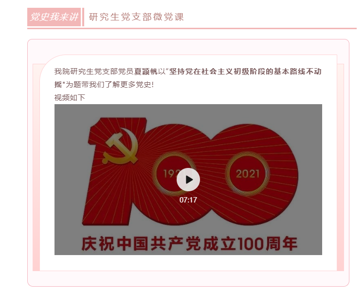 “事实证明,党的基本路线是党领导的伟大事业不断取得新的伟大成就的根本,是照耀党和国家各项工作前进的灯塔。”3月28日,生物与化学工程学院研究生夏颖帆以“坚持党在社会主义初级阶段的基本路线不动摇”为题,拉开学院“党史我来讲”主题微党课活动序幕。在7分钟的视频里,夏颖帆对党在社会主义初级阶段基本路线的内容、基本点等进行讲解,她说“通过这次讲党课,使我更加真切地认识到牢牢坚持党的基本路线是新时代正确认识历史方位、坚定中国特色社会主义方向的根本保证。这也让我意识到学生党员在学校里要体现青年的力量,攻坚克难的任务我们党员同志要主动承担,在学习上、业务上要出类拔萃。”