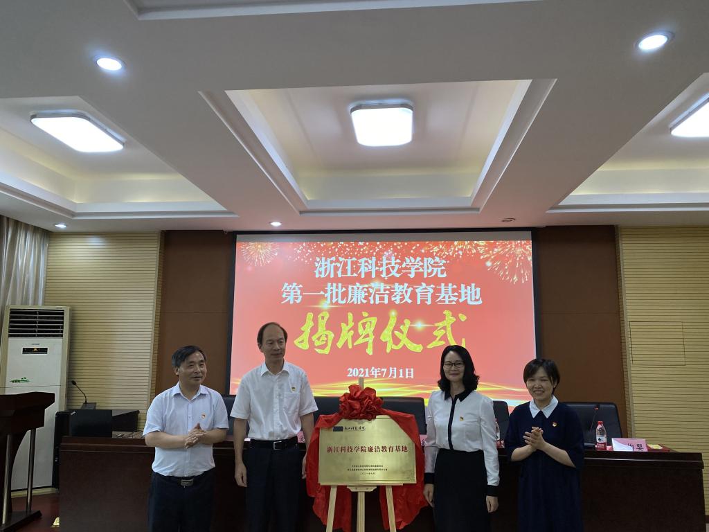 7月1日下午,申搏第一批“廉洁教育基地”揭牌仪式举行,以正气充盈的方式庆祝中国共产党成立100周年。校党委副书记周加敏、校纪委书记、省监委驻浙江科技学院监察专员陆爱华共同为“廉洁教育基地”揭牌。