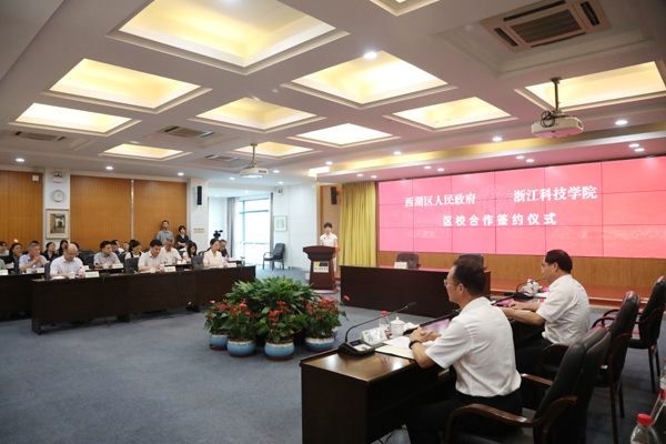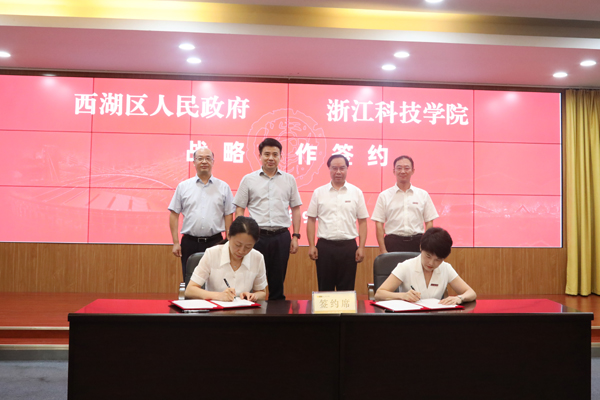9月17日,学校与西湖区人民政府战略合作签约仪式暨产学研合作活动在小和山校区举行。西湖区区长董毓民、常务副区长陈白磊、副区长马品芳,校长赵东福,副校长冯军、陈平出席,签约仪式由陈平主持。西湖区相关单位负责人及企业代表、学校相关部门负责人参加。陈平代表学校与西湖区人民政府签订《西湖区人民政府与浙江科技学院战略合作框架协议》,赵东福、冯军与董毓民、马品芳共同见证。根据协议,校地双方将共同推动平台共建、资源共享、人才共育,在科技创新平台、产学研合作协同育人、科技成果转化、校地校企交流、历史遗留问题处理等方面开展合作,共同推动西湖区高校经济高质量发展,实现学校高水平建设目标。