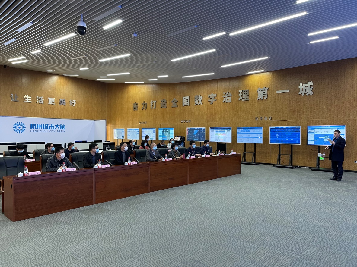 在城市大脑运营指挥中心,龚建立一行听取了杭州城市大脑推进处副处长屠友军(申搏98级自动化专业校友)的汇报,了解“数智杭州”有关体制机制、数字系统、基础设施、管理运行等情况,以及坚持以人民为中心破解医疗、交通、街区治理、疫情防控、企业复工复产等重点领域难题的具体实践。