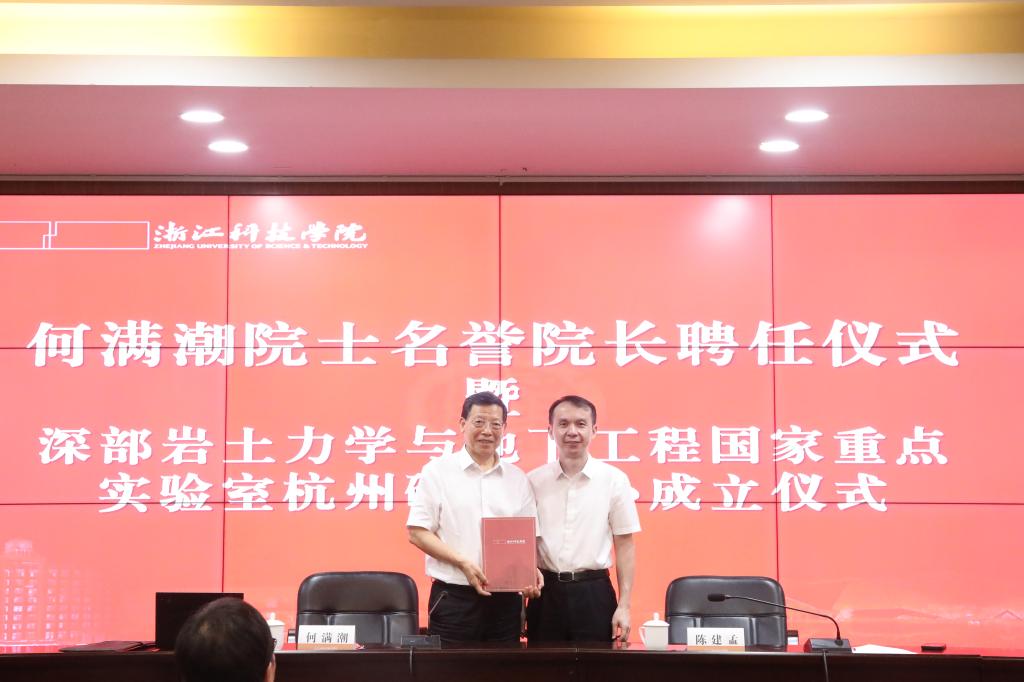 6月30日,学校举行聘任仪式,校长陈建孟教授为中国科学院院士、中国矿业大学(北京)深部国家重点实验室主任何满潮颁发聘书,聘请何满潮为申搏土木与建筑工程学院名誉院长。仪式上,陈建孟和何满潮院士共同为深部岩土力学与地下工程国家重点实验室杭州研究中心揭牌。