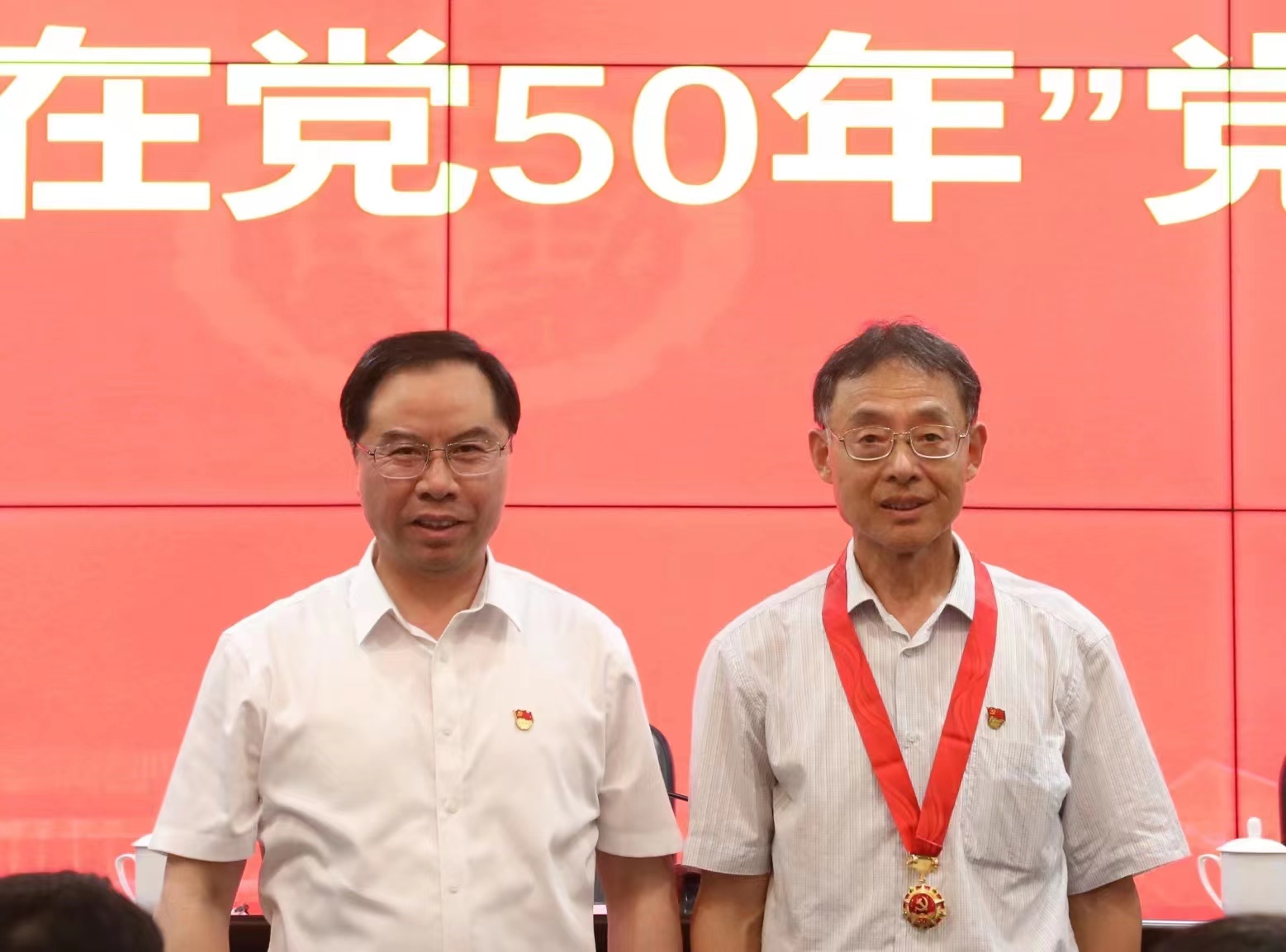 表彰大会上,校领导为“光荣在党50年”老党员张明新同志颁发纪念章,为校“红旗党组织”和“红星党支部”获得单位、校第二届微型党课大赛获奖师生颁发证书。