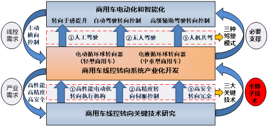 “商用车线控转向系统关键技术及产业化”针对商用车转向系统传递负荷大、电动化难度高问题,提出了基于C-EPS系统的自动驾驶和人工驾驶的切换方法、控制策略及装置,研发了线控转向控制器,根据驾驶状况进行驾驶模式的切换,解决了转矩控制和位移控制精度低、转角伺服控制不同步等难题,实现了车道保持高级辅助驾驶、无人驾驶等线控功能。