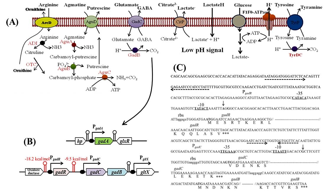 图1 L. brevis抗酸途径示意图(A),GAD系统基因结构组成(B)及gadRCB基因簇转录表达特征(C)