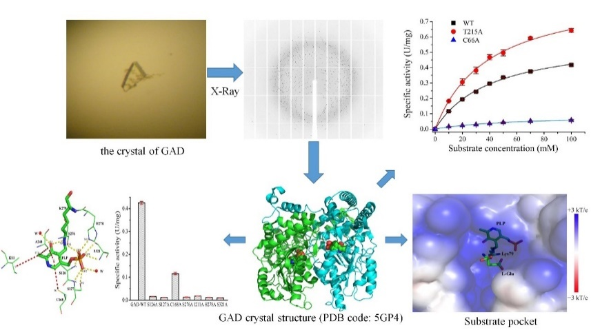 “乳酸菌谷氨酸脱羧酶系统应答酸胁迫及生物合成γ-氨基丁酸机理”针对乳酸菌生物合成新资源食品γ-氨基丁酸(GABA)的唯一关键限速酶—谷氨酸脱羧酶(GAD)开展了系统性研究,筛选到具有自主知识产权的高产γ-氨基丁酸(GABA)乳酸菌Lactobacillus brevis CGMCC 1306,鉴别并阐明了该菌株染色体上谷氨酸脱羧酶(GAD)操纵子结构及各功能元件的转录表达调控机制,解析了L. brevis GAD的晶体结构并从分子水平揭示了GAD的催化机制,提出并验证了pH调控GAD催化活性的机理假说,发展了GAD的酶分子改造手段,创新性地采用人工神经网络与粒子群进化算法相结合的过程优化方法,以及细胞固定化发酵、弱化内源F0F1-ATPase、耦合乳酸发酵等手段,对乳酸菌催化合成GABA的过程进行了强化,为利用蛋白质工程和代谢工程等手段实现了GABA高产工程菌株的构建、GABA的高效合成提供了重要的理论指导和技术支撑。