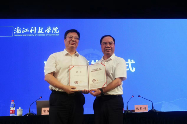 专题报告会前,举行了浙江科技学院客座教授受聘仪式,赵东福为喻运鑫颁发聘书。 (安吉校区综合办 张聪 学生记者 余雯慧)