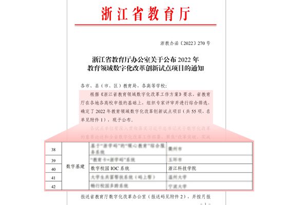 近日,浙江省教育厅公布2022年教育领域数字化改革创新试点项目名单,申搏申报的“数字校园IOC系统”项目入选试点项目名单。