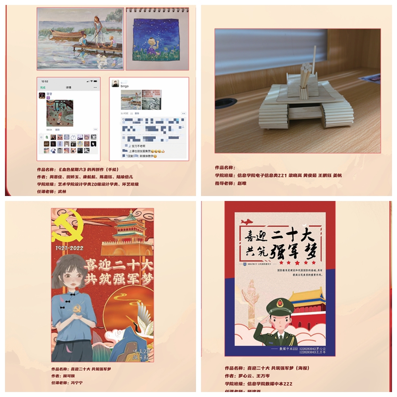 据马克思主义学院相关负责人介绍,全民国防教育是党的宣传思想工作的重要组成部分,是弘扬爱国主义精神、增强全民国防意识的有效途径。近日,中共中央、国务院、中央军委印发《关于加强和改进新时代全民国防教育工作的意见》,对全民国防教育作出全面部署。青少年学生是祖国的希望和未来,也是全民国防教育的基础,在第22个全民国防教育日来临之际,教研团队充分策划讨论,采取主题教学成果展示的形式,调动同学参与积极性,丰富实践载体,营造良好氛围,推动全民国防教育工作的深入开展。据介绍,此次活动覆盖2022年级全体学生和2020级、2021级部分学生,学生分组完成作品,活动共收到作品一千余件。