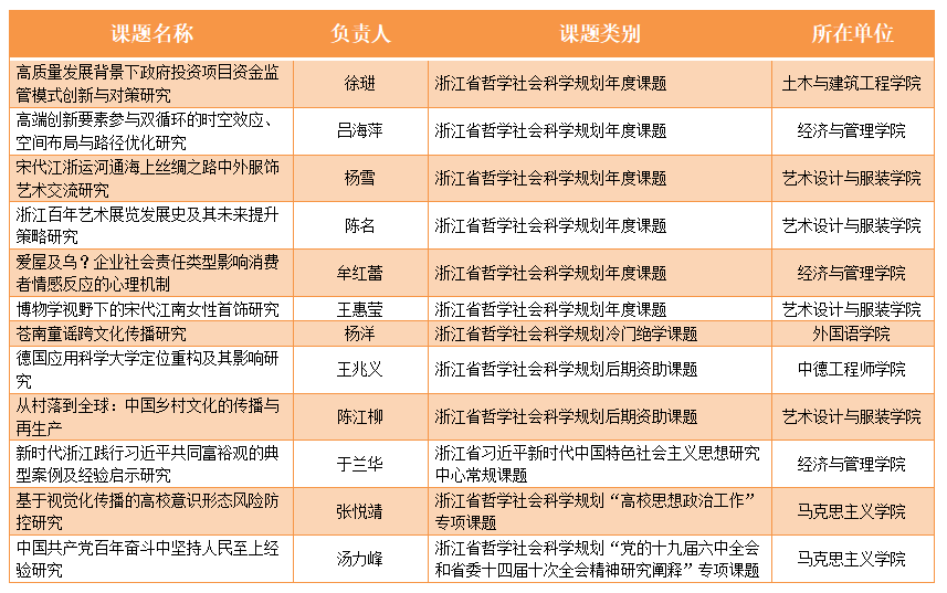 浙江省哲学社会科学规划课题包括年度课题、交叉学科和冷门“绝学”课题、后期资助课题以及各个专项课题,课题等级分为重大、重点和一般。省社科规划课题的研究体现鲜明的学术创新导向和突出的学术思想价值,其立项数量是衡量学校人文社科发展的重要指标。