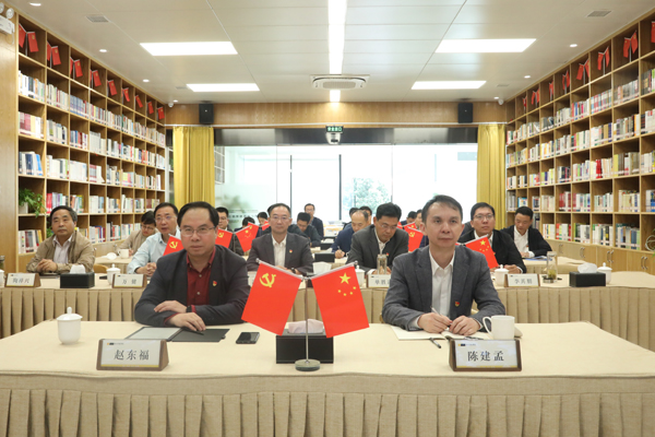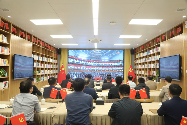 上午10点,小和山校区师生服务中心内,校党委书记赵东福、校长陈建孟等校党政班子成员和学校机关党委各支部书记集体观看直播。与会人员认真聆听报告,不时落笔记录。