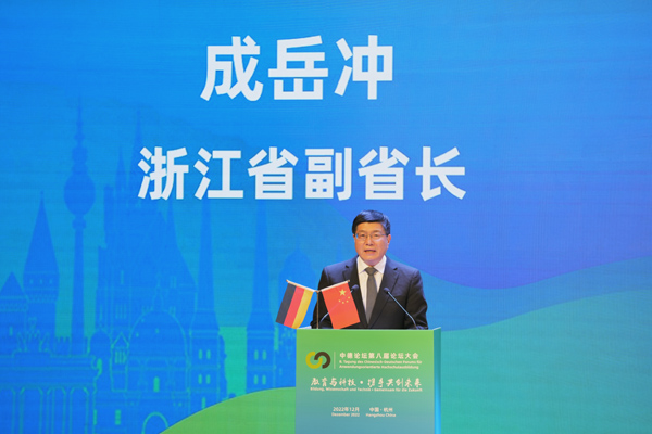 成岳冲在致辞中指出,教育合作是中德关系的重要组成部分,是巩固两国友好关系的重要桥梁。浙江省与德国的教育合作交流起步早、发展快、后劲足,取得了丰硕的成果,双方开展了形式多样、务实有效的交流合作,参与学校覆盖大中小学,总数超过300所。他希望两国与会代表深入探讨、凝聚共识、互学互鉴,继续深化两国在教育领域的合作,不断创新合作方式、提升合作质量,为寻求全球性问题的解决方案贡献“中德学校的共同智慧”。