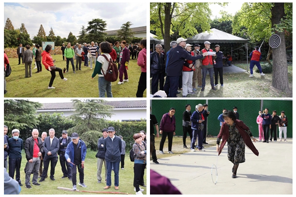 本次离退休职工趣味运动会根据老同志们的身体状况和兴趣爱好,设立了滚铁环接力、踢毽子接力两个集体项目,和运乒乓球、钓瓶、套圈、飞镖、画鼻子、九宫格等七个个人比赛项目。230余名离退休老同志参加运动会,在比赛中,老同志精神抖擞、认真专注,尽情地享受着比赛带来的乐趣。会场上有一位老师的身影十分特别,他已有94岁的高龄,提到运动会他笑脸洋溢。