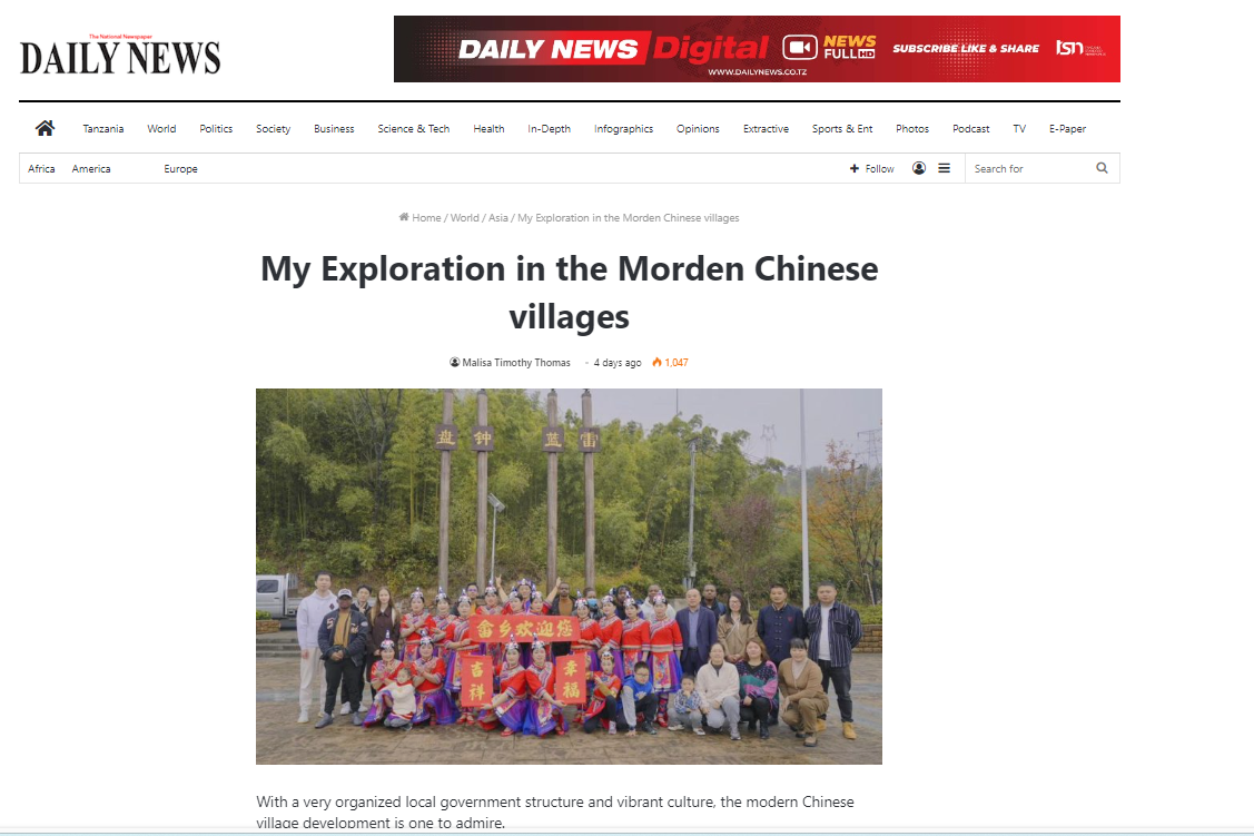 近日,申搏坦桑尼亚籍国际学生Malisa Timothy Thomas在坦桑尼亚主流英文报纸《每日新闻》(Daily News)发表文章《感知中国现代化农村》(点击阅读),讲述自己赴杭州市富阳区新登镇双江村和上山村参加“感知中国”社会实践课程的感受和体会。