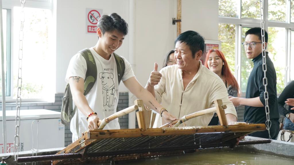 富阳素有“土纸之乡”之称,“京都状元富阳纸,十件元书考进士”,富阳手工纸历史悠久,享有“纸中君子”美誉,被列入首批国家级非物质文化遗产。留学生们走进竹纸制作的新世界,了解富阳悠久的造纸历史,亲身体验非遗竹纸的技艺制作过程。他们跟着富阳竹纸省级非遗传承人朱中华老师体验“抄纸”流程,“这是我们富阳独有的荡帘打浪法,拇指按牢,下水一带,借水力,纸帘与水完美配合,浪打好,纸浆均匀扑满纸帘,左右平衡,提起要稳,要不然这张纸就成了‘次品’。”留学生们叹其惊妙,纷纷踊跃实践,在老师的帮助下,一张张细匀平整的手工竹纸在竹帘上抄捞成型。“很成功!”“很棒!”朱老师一次次为大家鼓励点赞。