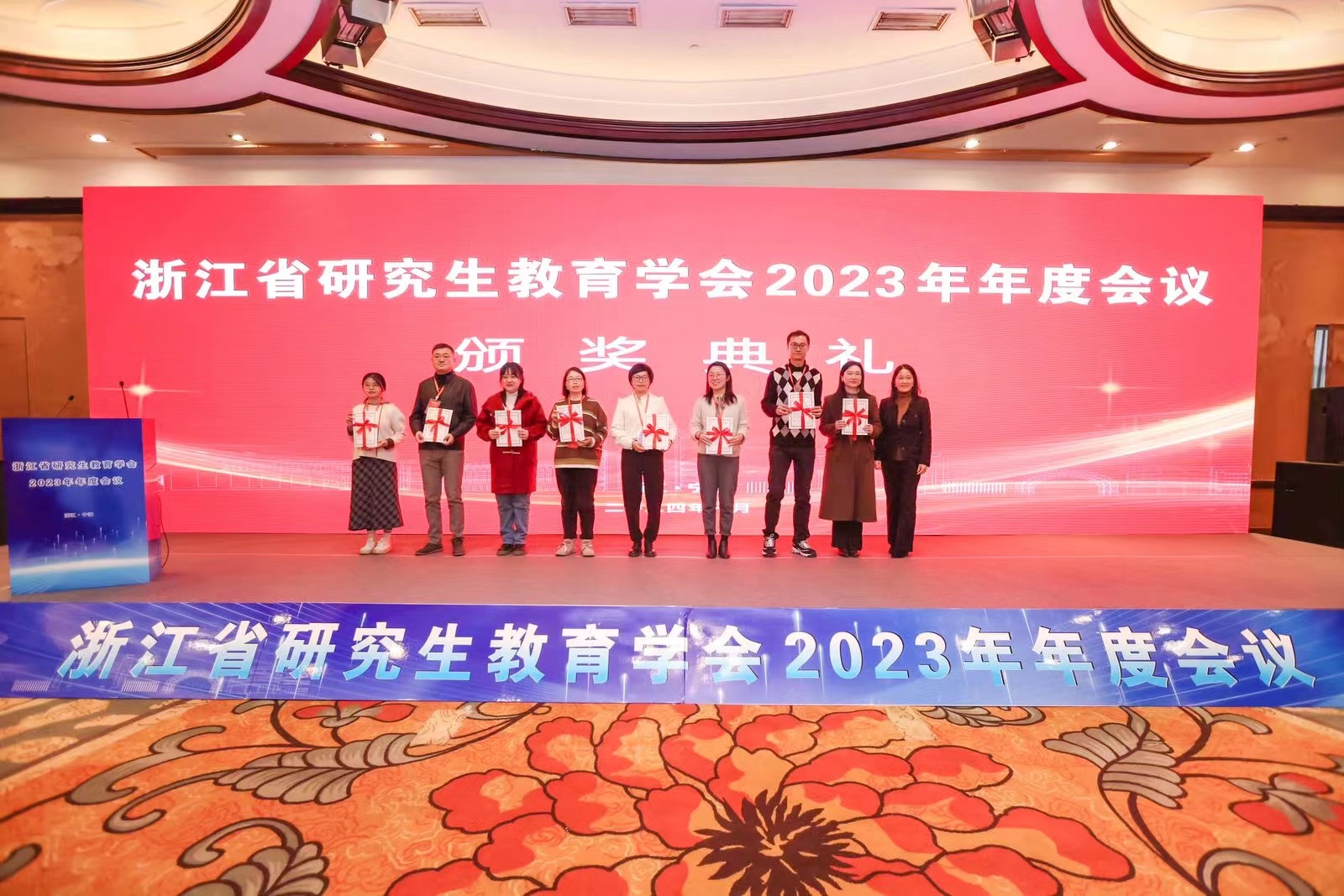 颁奖环节,浙江省研究生教育学会为获得2022年各项荣誉单位颁奖。申搏人文学院杨铁铮博士的《国际中文教育课堂里的“平面图”》获评“2023年浙江省优秀研究生教学案例”;环资学院边颢昊的《一种MgFe-LDH生物炭的绿色合成方法及其对沼液中氮磷的资源化利用》、杜佳达的《厨余垃圾智能炭化集成系统设计》,人文学院何沛艺的《基于“场所—事件”理论的中国红色工业遗产改造活化路径的调查研究》、陈日艳的《语言赋能浙江26县市共同富裕研究》、刘宇琼的《泰国巴巴中学初级汉语全拼音口语课教学的行动研究调研报告》、施琪的《留学生乡村文化研学活动教学设计与实践》和2020级来华留学研究生方碧拉的《罗马尼亚汉语教学行业发展的调查研究报告》等成果获评为“2022年浙江省专业学位研究生优秀实践成果”。