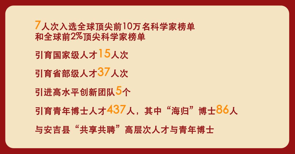 5年来,7人次入选全球顶尖前10万名科学家榜单和全球前2%顶尖科学家榜单,引育国家级人才15人次,省部级人才37人次;引进高水平创新团队5个;引育青年博士人才437人,其中“海归”博士86人。充分利用校地人才政策,与安吉县“共享共聘”高层次人才与青年博士。