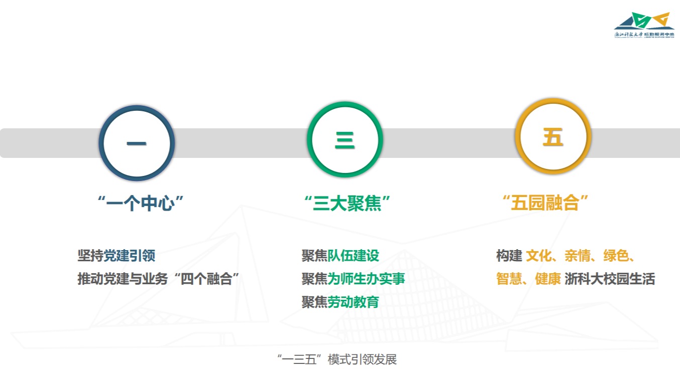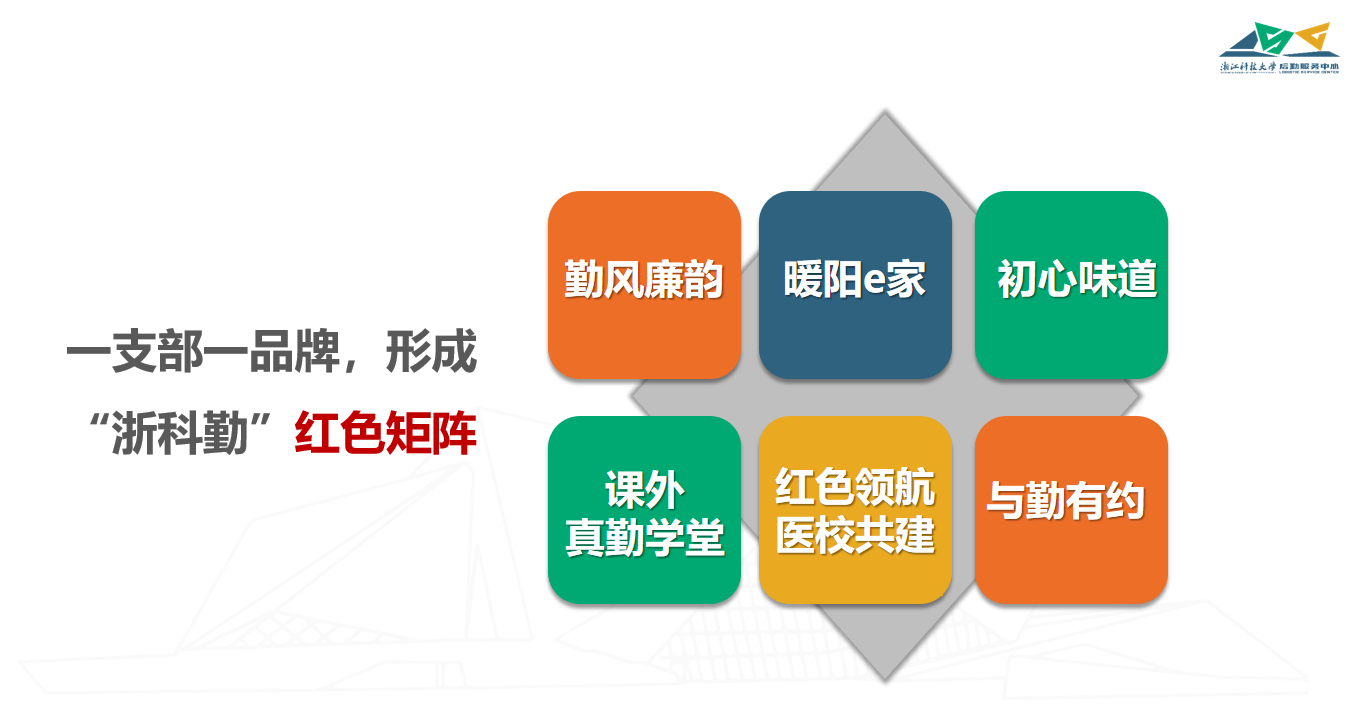 近年来,后勤服务中心党总支坚持“服务至善 育人至真”理念,培育创建“浙科勤”党建品牌,积极探索“一三五”模式,推动党建与业务“四个融合”,后勤服务质量提质创新,为学校事业发展贡献后勤力量。