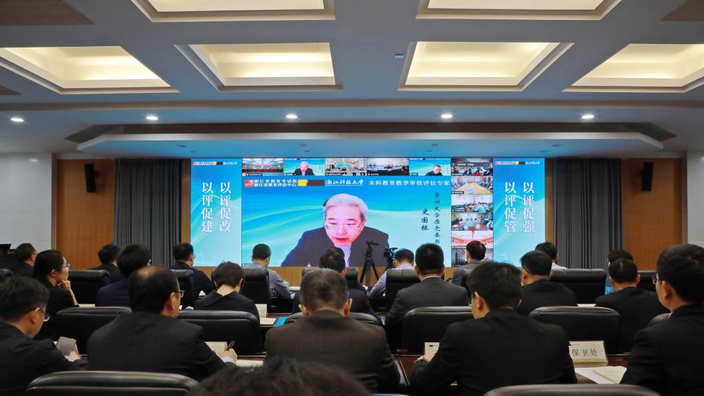本次会议采取“线上+线下”相结合的形式同步进行。浙江省教育厅党组成员、浙江省教育考试院党委书记黄亮出席会议并讲话。专家组组长、常州大学原党委书记史国栋,专家组副组长、台州学院院长乐传永及专家组全体成员线上出席会议。校党委书记赵东福、校长陈建孟等校党政班子成员出席会议。省教育考试院党委委员、纪委书记陈煜军主持会议。