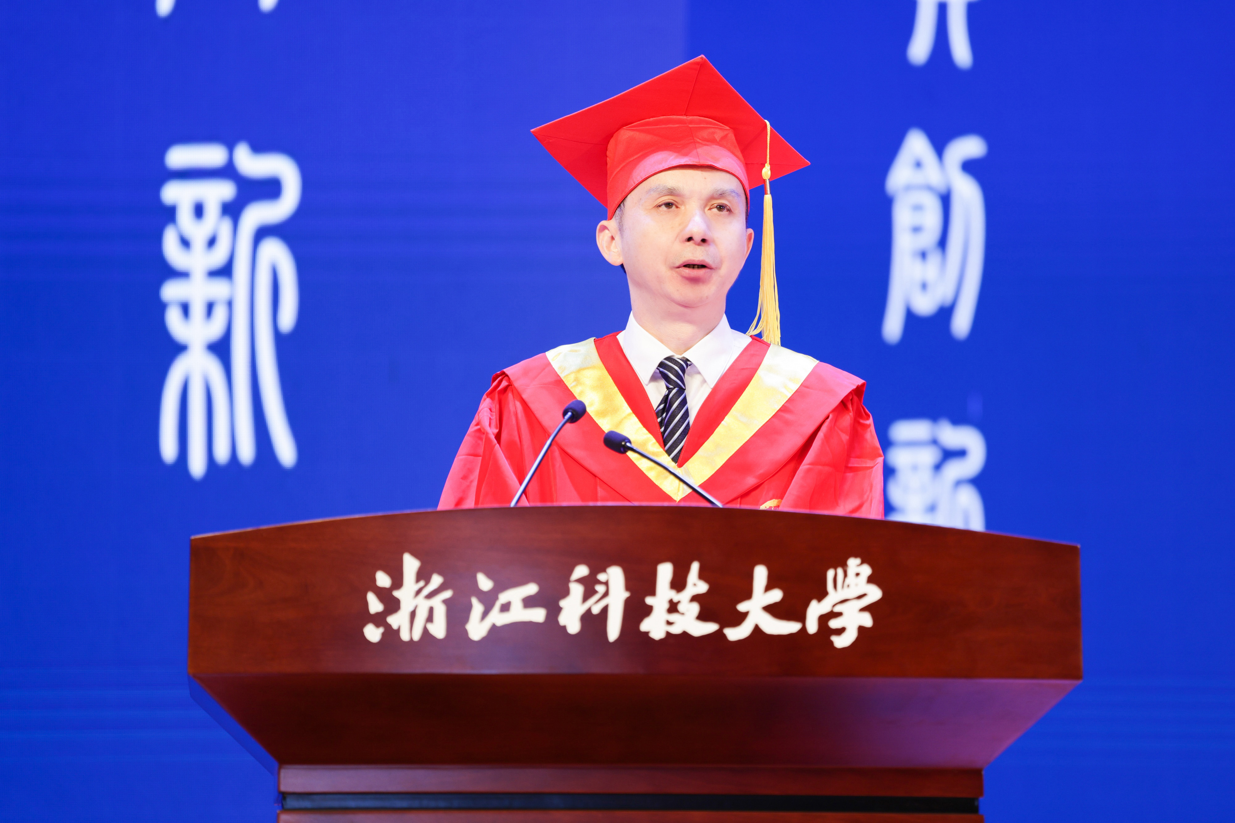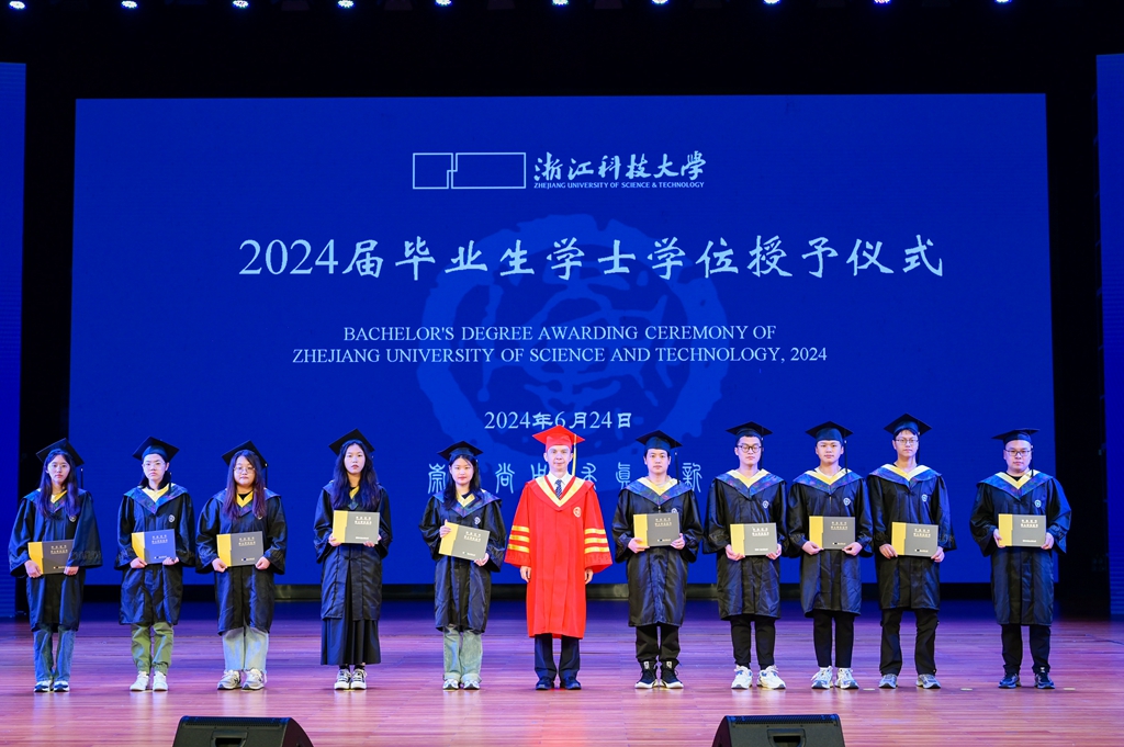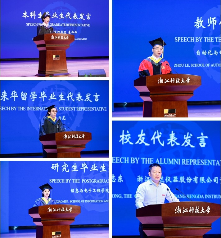 毕业生代表、经管学院本科生朱伟伟和信息学院研究生范晓敏,深情讲述了自己与浙科大相遇、在浙科大成长、从浙科大出发的经历,表示将带着老师的嘱托和母校的期许,带着真诚与热血继续前行,用努力书写无限可能。国际学院留学生丹尼表达了对母校及师长的感激与惜别之情,表示将以实际行动为促进国际友谊和中外文化交流贡献自己的力量。