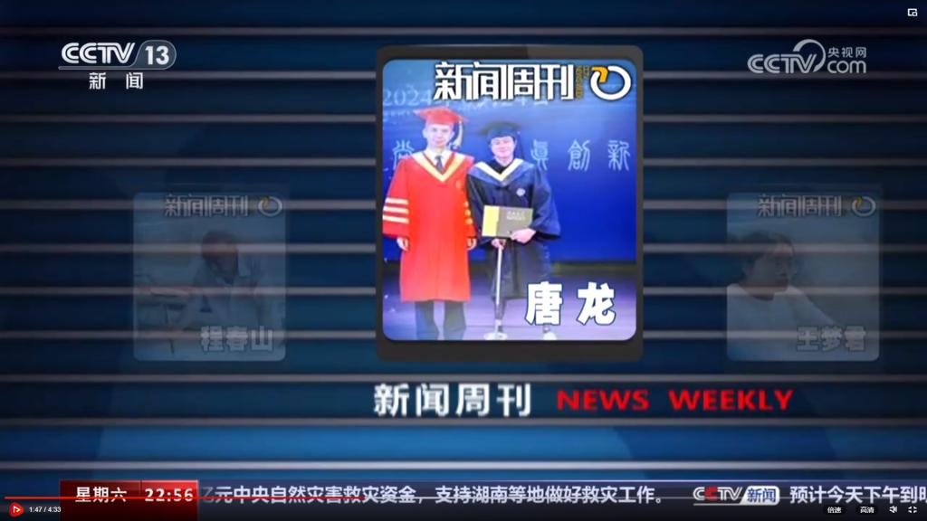 6日晚播出的《新闻周刊》在“本周人物”版块介绍了唐龙的故事,主持人白岩松点评:“对于23岁的轮椅少年唐龙来说,也许毕业典礼上行走的速度并不快,但是了解他从轮椅上勇敢地站起来迈开步,就知道这是另一种让人赞叹的速度”。
