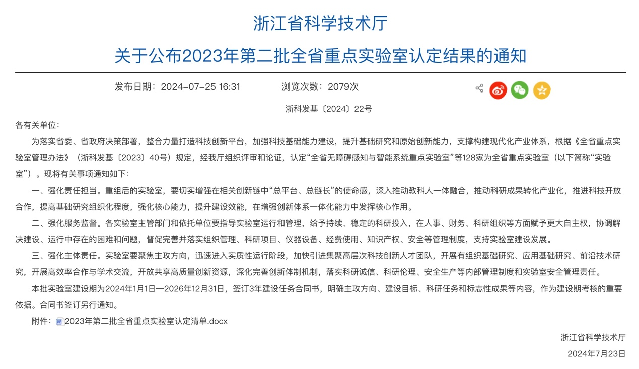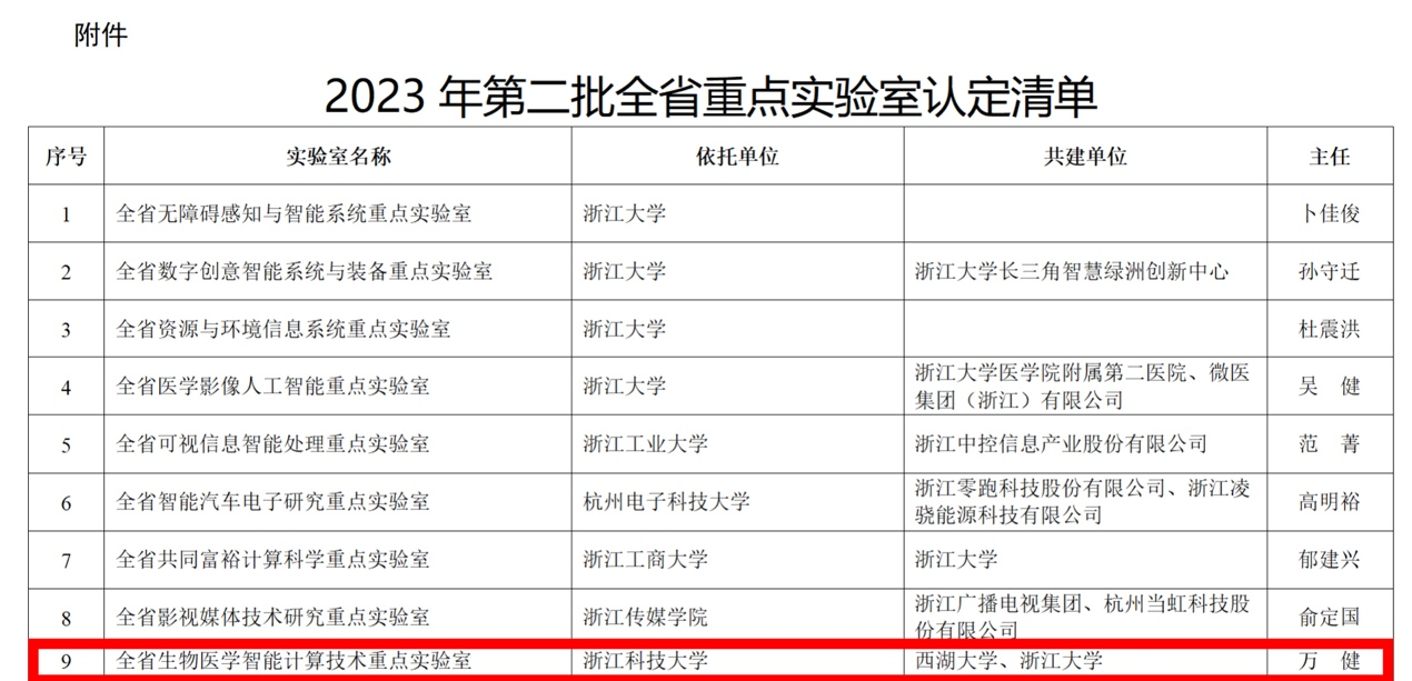 近日,浙江省科学技术厅发布《关于公布2023年第二批全省重点实验室认定结果的通知》,由SUNBET申搏牵头,联合西湖大学、浙江大学共同申报的“全省生物医学智能计算技术重点实验室”(BIT Lab)获批认定。