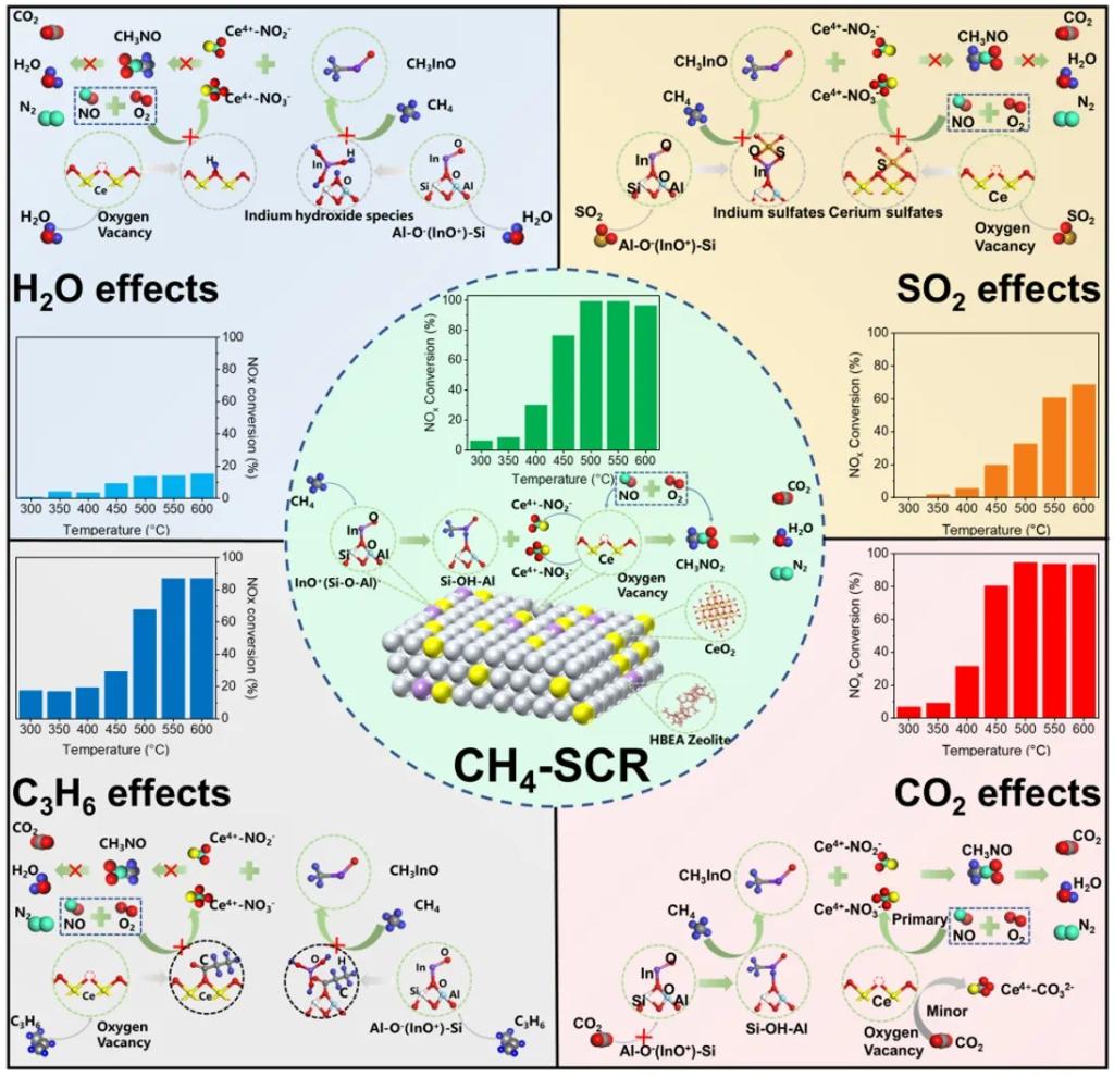 燃气发电机组具有高效节能的优势,在电力供应、船舶推进和工业生产中运用越来越广泛,逐步成为NOx的一个重要排放源。氨选择性催化还原技术是国内外应用最广泛的脱硝技术。然而,由于还原剂氨的储运和使用存在成本高、风险大、易逃逸等问题,探寻氨的替代物成为选择性催化脱硝技术当前主要发展方向之一。甲烷作为天然气的主要成分,是充当还原剂用于燃气发电机组烟气脱硝的理想选择。该论文报道了一种高效的铈铟双活性位分子筛催化剂,能有效利用甲烷作为还原剂去除燃气发电机组烟气中的NOx,并深入研究了该催化剂的催化机理和中毒机制,为推动实现燃气发电机组烟气NOx近零排放具有重要意义。 (环资学院 李立园)