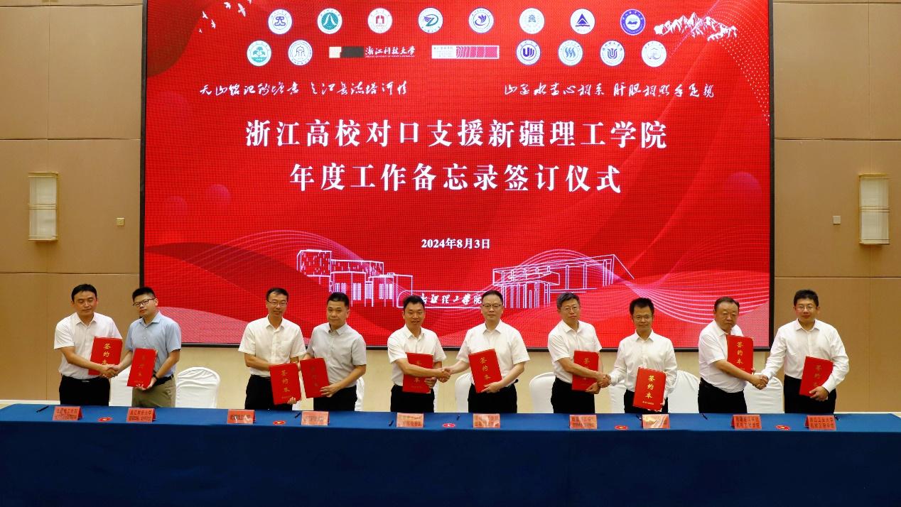 浙江高校对口支援新疆理工学院“一校一院”机制,即“1所浙江高校对口帮扶新疆理工学院1个学院、1-2个专业或1个处室”,是在进一步做实“浙—阿本科高校发展联盟”基础上,推动浙江省15所高校对口援疆工作往实里走、往深里走的新举措。新机制将坚持目标导向和需求导向,按年度签订工作备忘录,实现工作重心下移,做到目标具化、措施实化、成效显化,进一步提升对口支援的系统性和精准性。研讨会上,浙江省15所高校相关部门与新疆理工学院各二级学院和职能部门签订“一校一院”年度工作备忘录20份,挂牌对口支援共建学院13个。申搏挂牌支持新疆理工学院能源化工工程学院建设,宣传部、人事处、科研处、机能学院分别与新疆理工学院对口职能部门、学院签订年度工作备忘录。