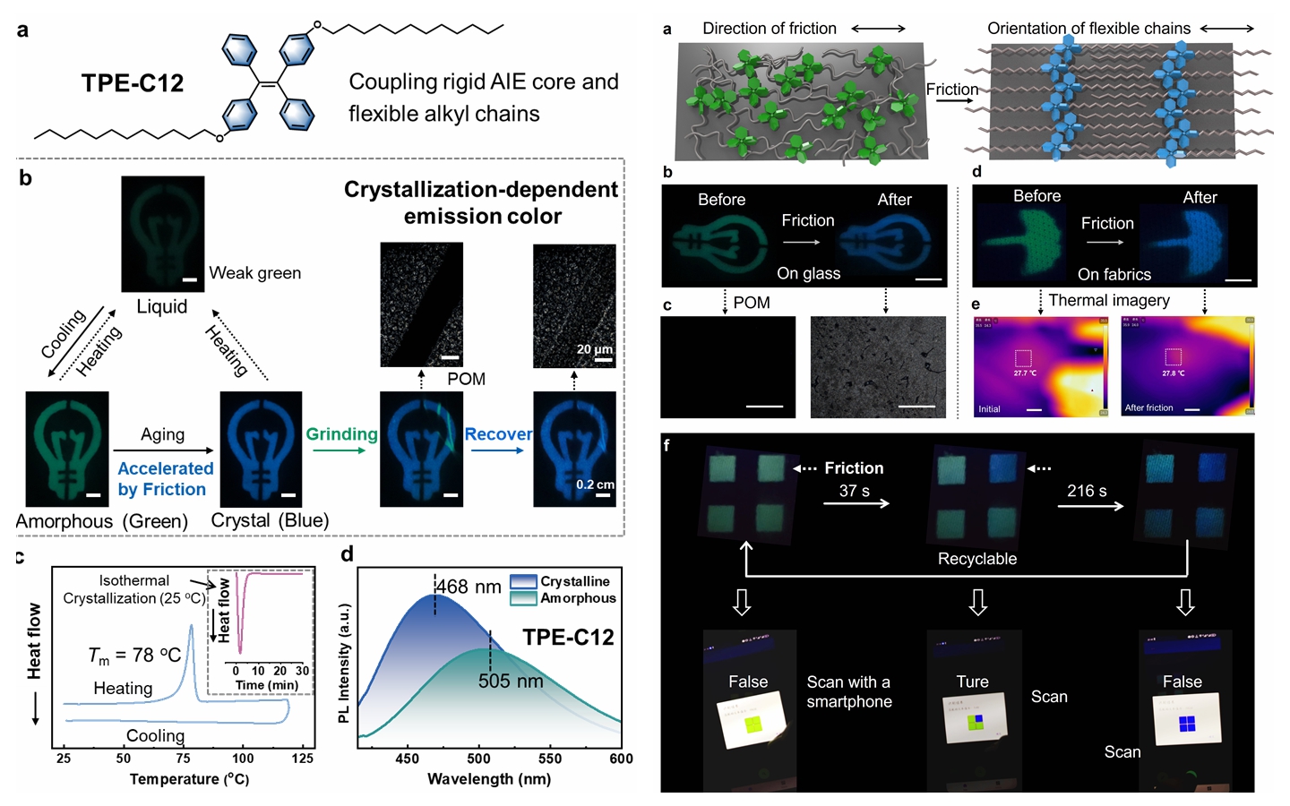 机械致变荧光(ML)材料高灵敏度成为化学与材料科学领域的研究重点及重要挑战,先进聚合物和表界面材料团队发展了“摩擦诱导结晶”策略,开发了一类新型高灵敏度ML材料。这一新材料融合了柔性聚合物链与聚集诱导荧光核心,具有滞后结晶动力学和结晶依赖的发光特性,从而实现荧光信号的高灵敏转变,成功应用于多级信息加密的摩擦解码。这项工作通过分子级运动的精确调控构筑了高灵敏度ML材料,有望带动下一代信息防伪光学材料的设计开发与工程应用。