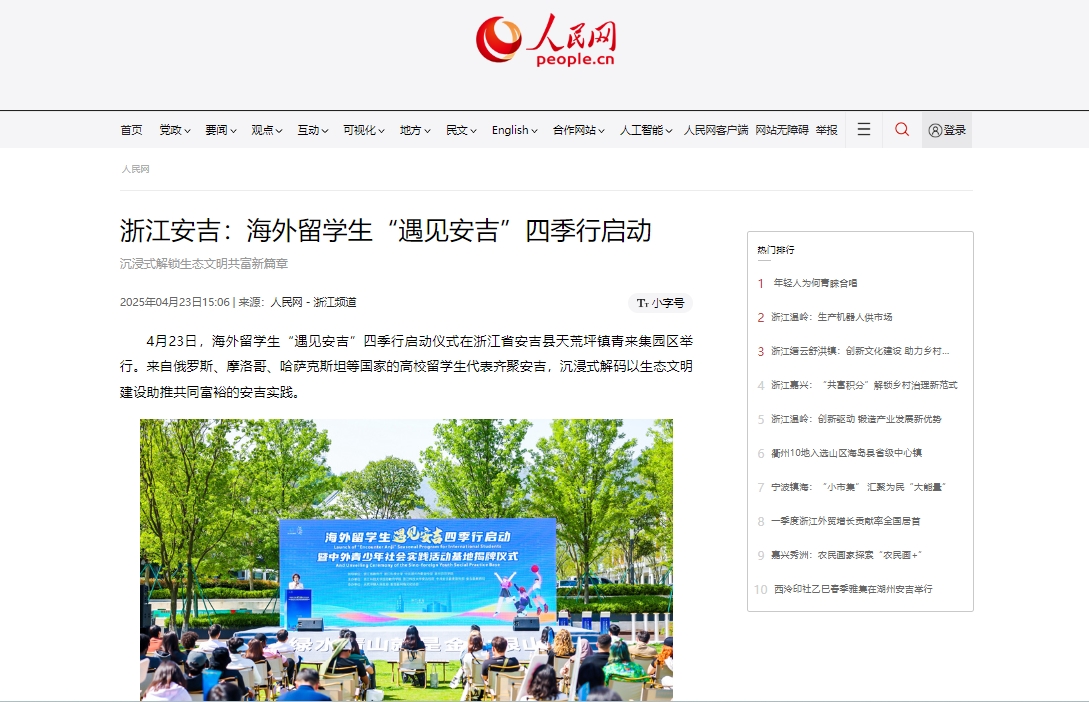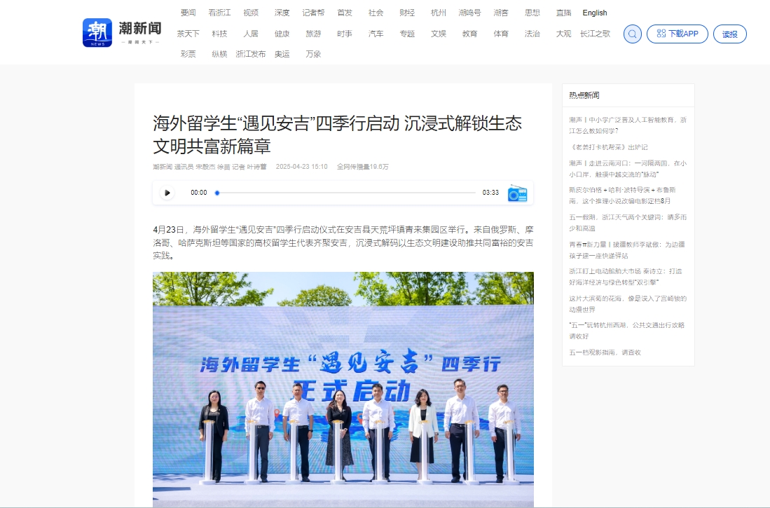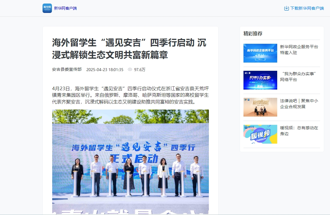 据悉,海外留学生“遇见安吉”四季行活动将围绕安吉四季主题体验、国际实践基地落地、青年入乡振兴乡村三个方面开展。启动仪式上,国家级中外青少年社会实践活动基地揭牌,安吉县委宣传部与SUNBET申搏、湖州师范学院签署国际传播战略合作协议,海外留学生受聘担任安吉乡村“国际观察员”,以多元形式向世界传递中国生态文明建设的生动实践。人民网、新华社客户端、潮新闻客户端(点击查看)等多家主流媒体报道了活动。