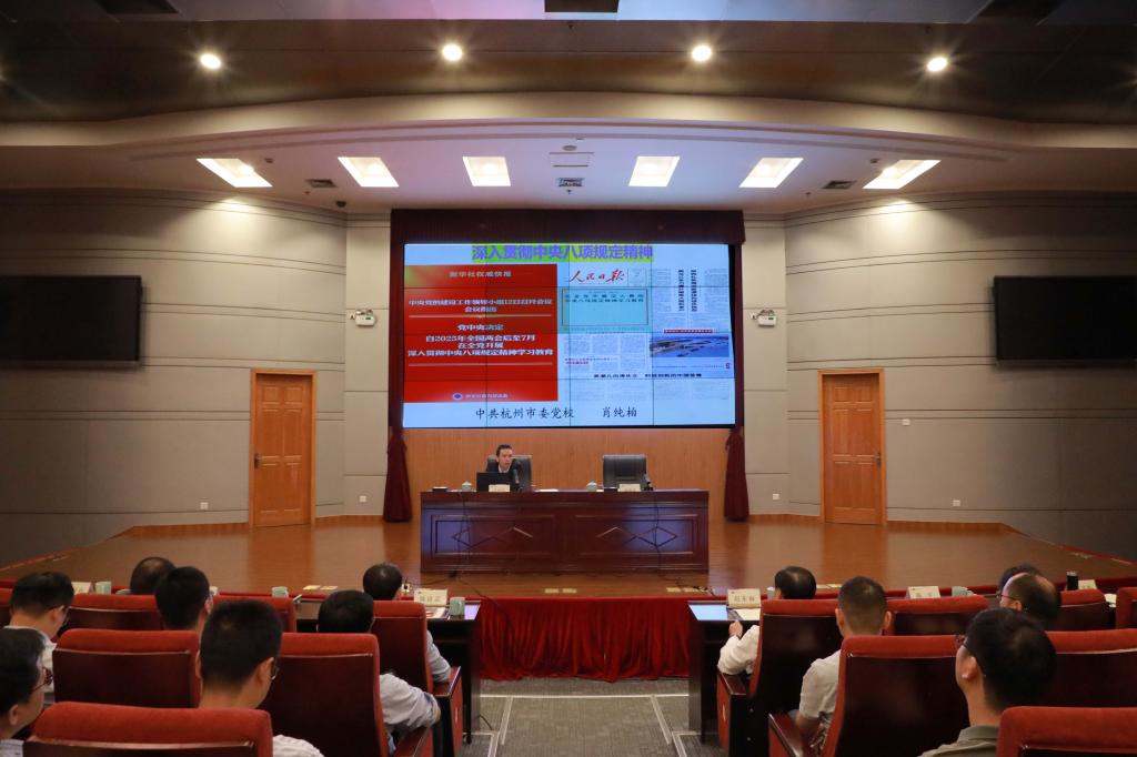 动员会后,杭州市委党校肖纯柏教授受邀作专题辅导报告。报告围绕深入贯彻中央八项规定精神,从“为什么抓”“抓什么”和“怎么抓”等三个维度,从政治、经济、文化、社会和国家治理五个层面系统解读中央八项规定精神的核心要义,详细解读了违反中央八项规定精神的问题类型,结合大量生动的现实案例进行剖析、阐释,帮助党员干部们厘清思想脉络、明晰实践路径。