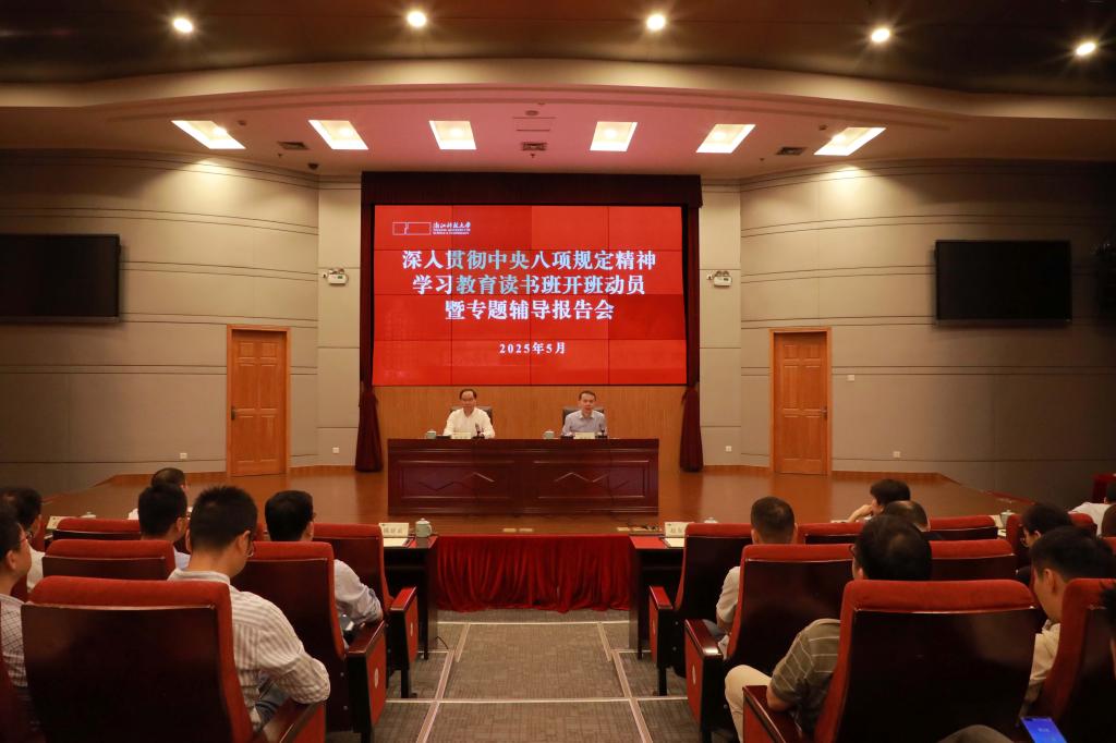 5月8日,学习教育读书班开班动员暨专题辅导报告会举行。校党委书记赵东福作开班动员。会议由党委副书记、校长陈建孟主持,校党政班子成员出席。