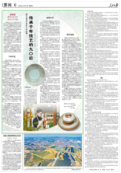 《人民日报》“讲述·赓续历史文脉 谱写当代华章”专题,4月30日以《浙江龙泉青瓷匠人叶晨曦——传承千年技艺的九〇后》为题,整版讲述了叶晨曦传承非遗技艺、将龙泉青瓷推向更广阔舞台的故事。(点击查看原文)