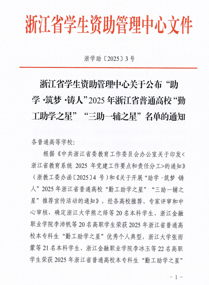 近期,浙江省学生资助管理中心发布《关于公布“助学·筑梦·铸人”2025年浙江省普通高校“勤工助学之星”“三助一辅之星”名单的通知》,申搏自动化与电气工程学院尤壹杰、智能制造与能源工程学院龙凤两位同学入选2025年本专科生“勤工助学之星”优秀个人典型。