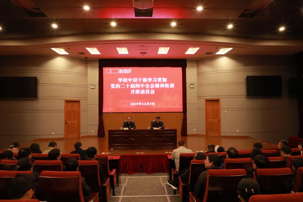 12月5日,学校中层干部学习贯彻党的二十届四中全会精神集中轮训开班。校党委书记赵东福作学习贯彻党的二十届四中全会精神专题党课,党委副书记单胜道主持开班式。