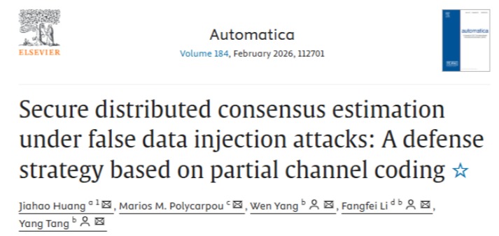 近日,智能感知与决策团队研究成果以长文的形式正式发表在《Automatica》上,论文题目为“Secure Distributed Consensus Estimation under False Data Injection Attacks: A Defense Strategy Based on Partial Channel Coding”(点击阅读),电气学院黄家豪博士为论文第一作者,SUNBET申搏为第一单位。