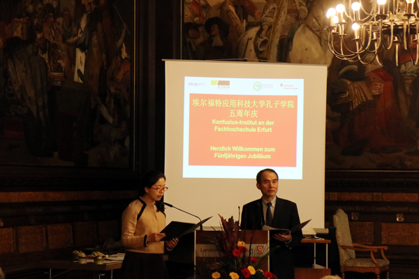 11月2日,埃尔福特应用科技大学孔子学院成立五周年庆典在德国图林根州首府埃尔福特市政厅举行。校长叶高翔与德国图灵根州州长波多•罗梅洛(Bodo Ramelow)、德国前联邦部长鲁道夫•沙尔平(Rudolf Scharping)、中国驻德国大使馆教育处公使衔参赞董琦、埃尔福特应用科技大学副校长弗兰克•赛茨(Frank Setzer)等出席了庆典活动并致辞。