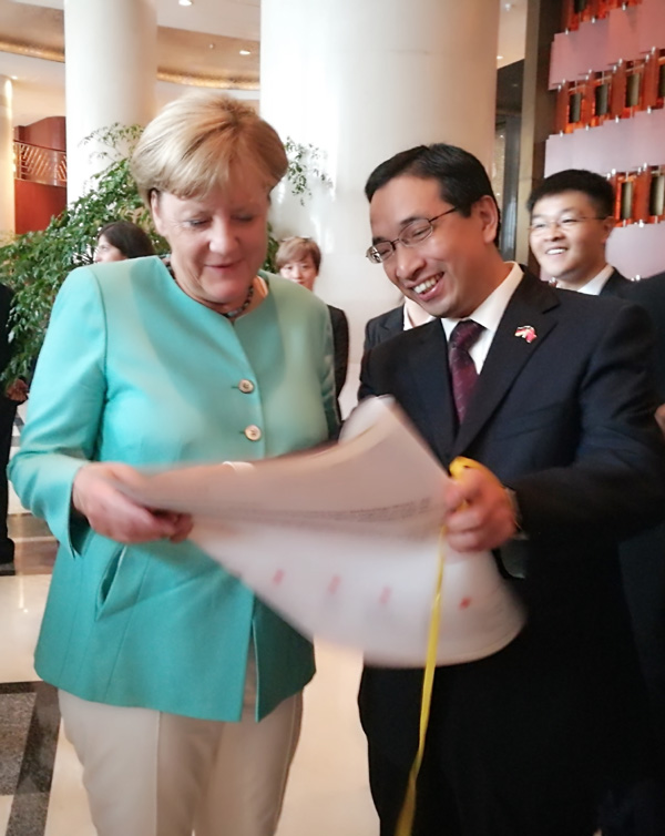 默克尔接见前夕,校长叶高翔专程拜访了中国驻德大使史明德,汇报申搏中德合作的历史和成果,并表达了良好夙愿;郑友取也专程拜访了德国驻上海领事馆总领事罗腾(Peter Rothen)。