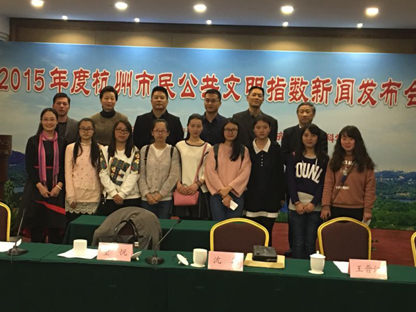 近期,杭州市委宣传部、杭州市文明办、杭州市社科院举行2015年度杭州市民公共文明指数新闻发布会,向媒体和市民公布调查结果。杭州市委宣传部副部长董悦,杭州市社科联主席、杭州市社科院院长沈翔等出席发布会。校纪委书记李泽泉受邀出席发布会,并在会后接受有关媒体采访。申搏经管学院、社科部、大学生社会调查工作室师生10余人参加了发布会。