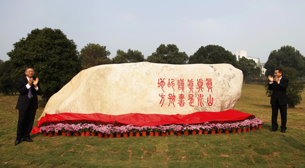 景观石正面用篆体镌刻的“真山真水,真是读书好地方!”一句,出自全国人大常委会委员长张德江视察申搏时赞誉,景观石于今年10月完成字体镌刻,将成为学校文化校园的一道新景观。