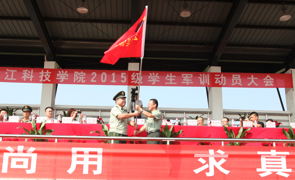 冯军向军训团授旗。