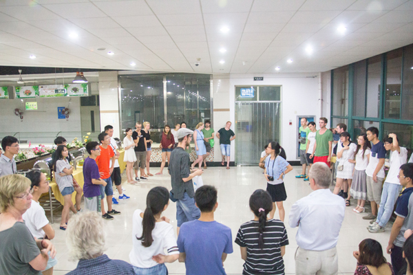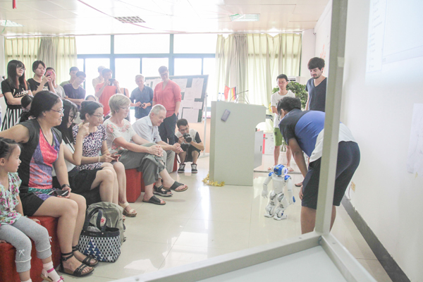 | 日前,第九届中德暑期夏令营落下帷幕。德国汉诺威应用科技大学4名机械、电气、计算机和艺术专业教授、14名学生,以及申搏2013级即将赴德国汉诺威应用科技大学学习的31名2+3项目学生参加夏令营,德语专业二年级学生担任夏令营志愿者。副校长郑友取出席开营仪式,希望中德两国学生珍惜机会,共同学习,收获友谊和成长。 汉语课上,申搏老师从基本的声母、韵母开始,逐步过渡到简单的生活用语,申搏同学配合,与德国学生对话中文练习。申搏同学准备丰富的课件,介绍中国文化,讲述两国文化的差异;周末,还带领德国学生游览杭州,了解杭州的历史文化。德国教授的专业课堂上,申搏“2+3”项目学生与德国学生一起上课,提前体验德国高校上课方式,各专业教授传授学科最前沿的知识,机器人、自动扫地机、数字影象都走入课堂,艺术专业教授Felix还布置两国学生共同创作以两校合作30年为主题的作品。 中德两国学生还一起参观了中国茶叶博物馆、佑康公司,游西湖,练太极,举办联欢会。在学习成果展示会上,以专业为组别,两国学生共同展示了短短两周各自专业学习的成果。 图1 德国教授、学生展示中文学习成果 图2 两国学生共同创作以两校合作30年为主题的作品 图3 2+3项目学生与机器人对话 图4 中德两国师生联欢会 外语/中德学院