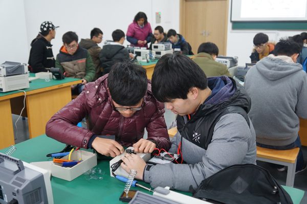 图2:学生在金工实习基地、电工电子基地认真实践