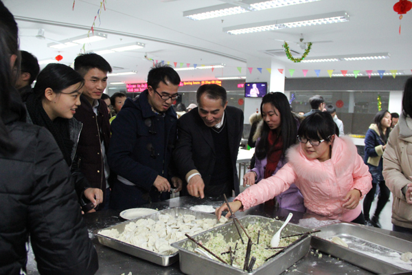 “吃饺子喽!”2014年12月31日晚八点,安吉校区食堂二楼,校领导王建华、叶高翔、周加敏、赵东福、冯军、李泽泉,部分教职员工与在校学生一起包饺子、吃饺子,其乐融融迎新年。