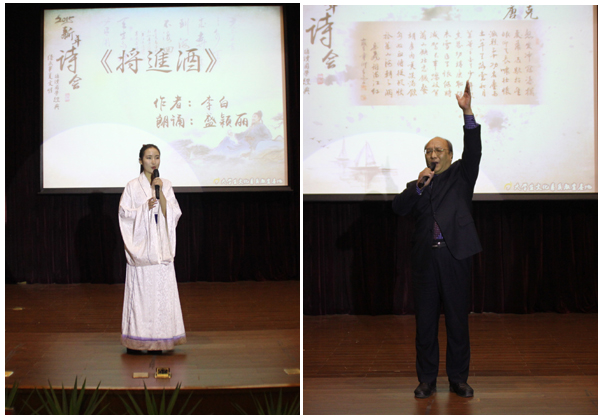 琴弦悠悠,诗声朗朗,诗会在校民乐队《步步高》的乐曲声和曲调优美抒情、委婉动听的合唱《晚风》中拉开帷幕。诗会分“一曲新词酒一杯”、“笙歌竞奏汉宫春”等四个篇章,分别演绎了中国古典诗词等传统文化经典。如李白的《蜀道难》、苏轼的《念奴娇•赤壁怀古》、张若虚的《春江花月夜》、陆游的《钗头凤》、白居易的《长恨歌》、曹操的《短歌行》等等。其中,浙江广电集团主任播音员、国家级普通话水平测试员唐克更是以一首充满爱国精神饱含英雄气概的《满江红》掀起本次诗会的高潮。在充满中国古典诗词文化的典雅气氛中,来自孟加拉国的留学生王力和来自乌克兰的留学生法提玛与和风文学社的同学《摸鱼儿•雁丘词》,在用汉语朗诵经典的同时,他们用丰富的表情和形象的肢体语言向大家展示了对这首词的理解和认识,轻松而又自然,舒畅而又美好,极富感染力,赢得了全场的掌声。来自申搏安吉校区的同学首次参加新年诗会,他们特意排练了诗朗诵《透过历史的眼眸》和《念奴娇•赤壁怀古》,表现了大一新生崭新的精神面貌和对文化经典的热爱。