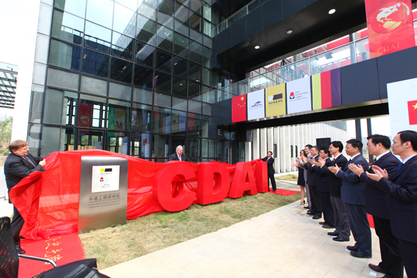 在与会领导见证下,叶高翔和吕贝克应用科技大学副校长利兹、西海岸应用科技大学校长科尔希共同为中德工程师学院揭牌。