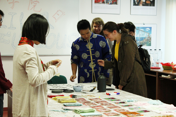 “印象浙江”摄影作品展和“中国文化互动展台”活动也在克鲁日孔院的教室进入高潮。“印象浙江”摄影作品展共展出摄影作品三十幅,观众被中国传统文化经典的美所打动,又为今日中国的发展所叹服。“中国文化互动展台”前,观众亲身体验写书法、剪纸、吹墨画、编中国结、下象棋、拼七巧板等中国传统文化活动(图2)。克鲁日孔子学院下设孔子课堂还将于9月30日在胡内多阿拉举行大型文艺演出。