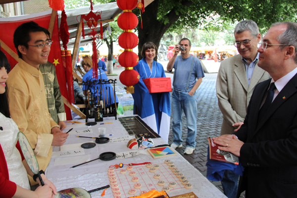 中国结、福字帘、红灯笼、对联,富有中国元素的克鲁日孔院文化展台格外醒目。开幕式后,克鲁日市长Emil Boc先生来到孔院展台前参观,他拿起展台上的一本《论语》和孔院教师饶有兴趣地谈起孔子,他说:“我读过孔子的书,孔子的思想在今天仍具有价值和实用性,我为我们城市能拥有孔子学院而感到骄傲!”(图二)