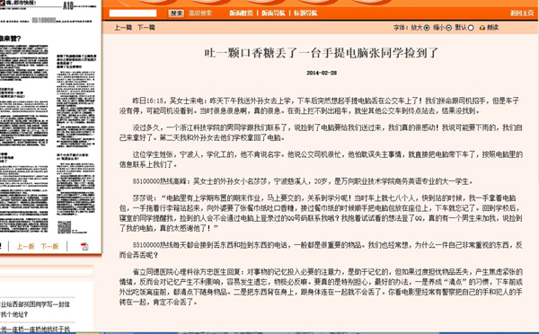 报道中,快报读者吴女士打进报社热线说:“昨天下午我送外孙女去上学,下车后突然想起手提电脑丢在公交车上了!我们拼命跟司机招手,但是车子没有停……没过多久,一个浙江科技学院的男同学跟我们联系了,说捡到了电脑要给我们送过来,我们真的很感动!我说可能要下雨的,我们自己来拿好了。第二天我和外孙女去他们学校拿回了电脑。”快报记者找到了这位拾金不昧的张同学,张同学不肯透露名字,只说:“公交司机很忙,他怕耽误失主事情,就直接把电脑带下车了,按照电脑里的信息联系上我们了。”